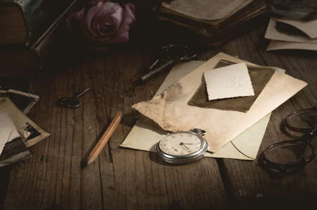 old photos and letters on the wooden table