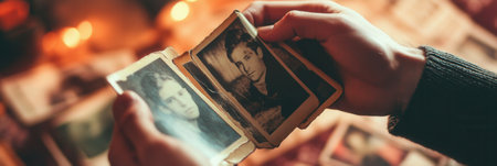 Hands hold gently old photographs, evoking memories and a sentimental atmosphere in a cozy, warm toned environment.