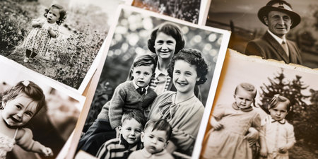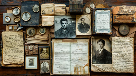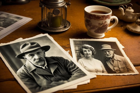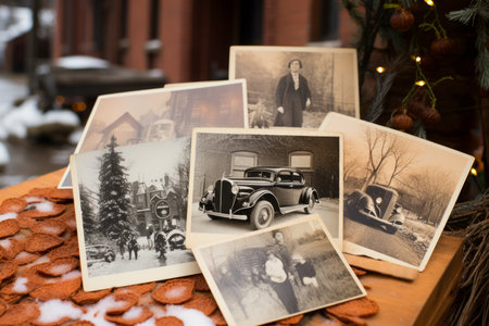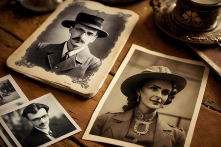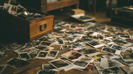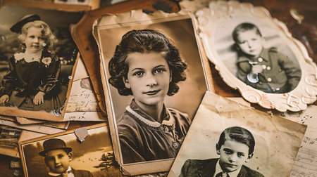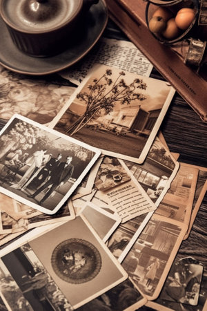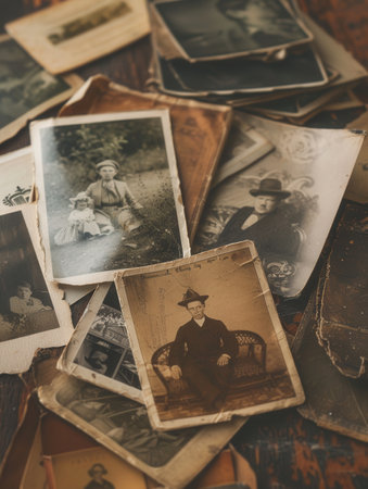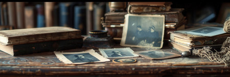 Old, vintage photographs scattered on an antique table create a timeless atmosphere, evoking memories and stories from the past.