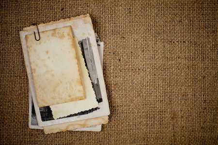 Stack old photos on table. Mock-up blank paper. Postcard rumpled and dirty vintage. Retro card
