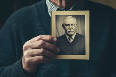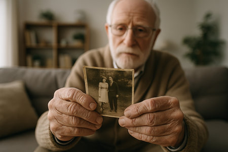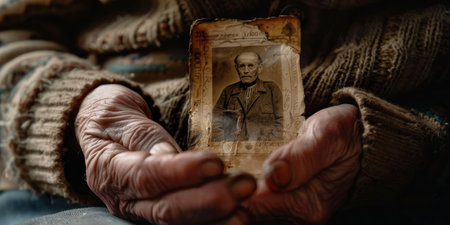 Close-up of a senior man's hands holding a family photograph, with a blurred background to symbolize fading memories.