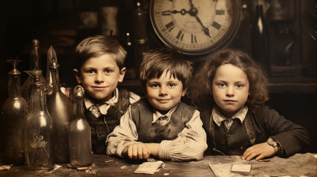 Portrait of a group of children in the style of the 19th century. Generative AI.