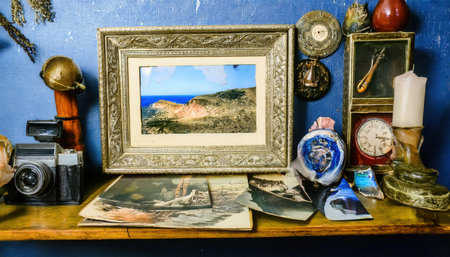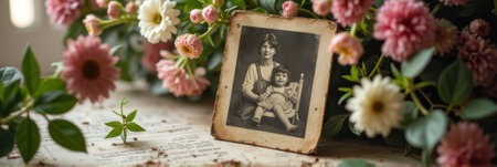 An old photograph in a frame with a blank space for a cherished memory, surrounded by dried flowers and vintage items, symbolizing nostalgia and longing