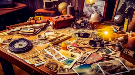 Table covered with old photos and other items. Generative AI.