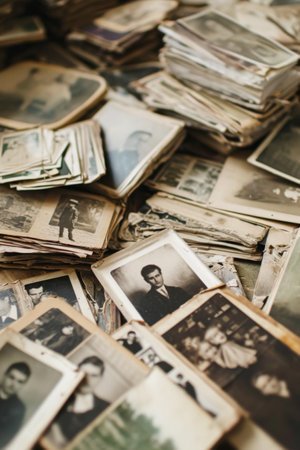 Crumpled and yellowed photographs capturing memories from a bygone era