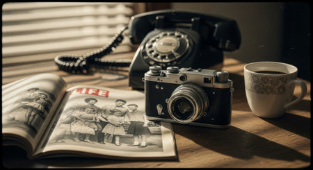 A vintage camera rests on a rustic table, surrounded by scattered black and white photographs and old books, evoking a sense of nostalgia and creativity.
