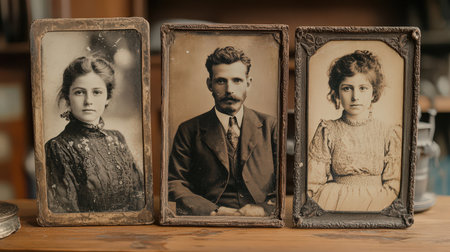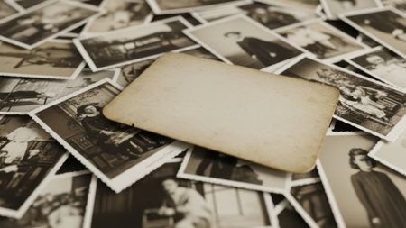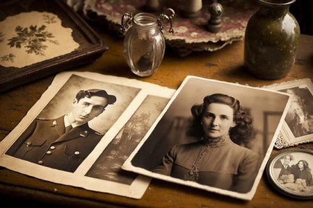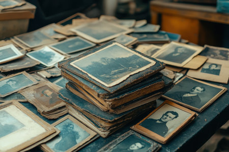 Old, vintage photographs rest on an antique table, creating a warm, nostalgic atmosphere perfect for antique shops or vintage studios.