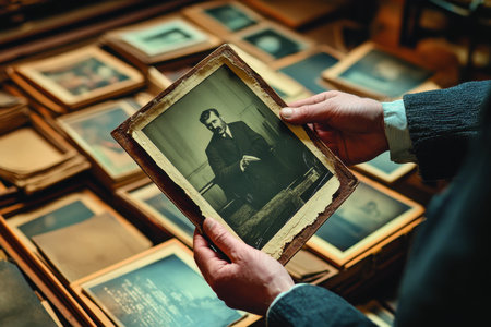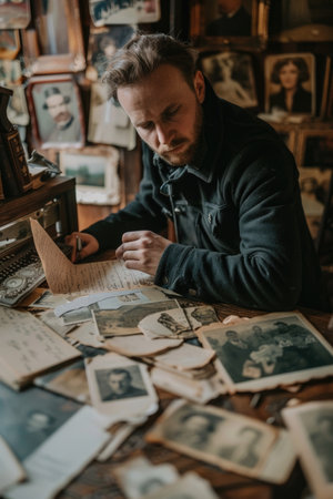 A person examines an old portrait in a collection of vintage photographs, surrounded by aged images and memorabilia, evoking nostalgia and curiosity about the past.
