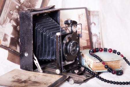 Retro camera and old pictures on the table. Retro photo and vintage.