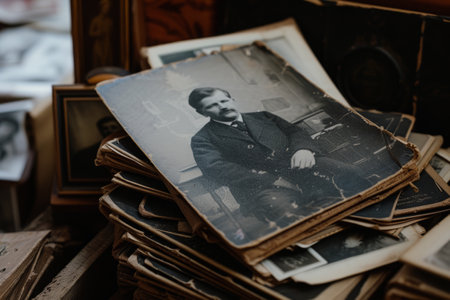 A solitary vintage portrait of a young man is displayed prominently among a collection of old, worn photographs. The setting is a dusty archive filled with memories and history, evoking a sense of nostalgia.