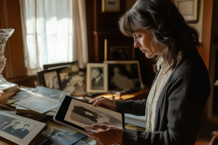 Genealogist carefully examining digitized old photographs on a tablet, surrounded by historical documents and framed pictures in a vintage archive