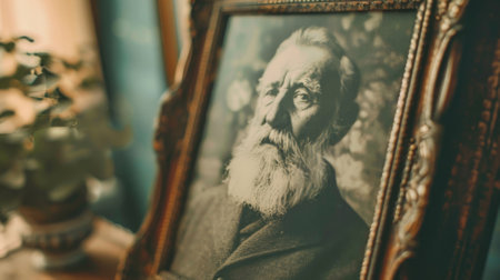 Black-and-white portrait of older bearded male in vintage frame