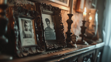 Vintage black and white family portraits frame rustic mantel with antique decor, candles, intricate frames, dim lighting