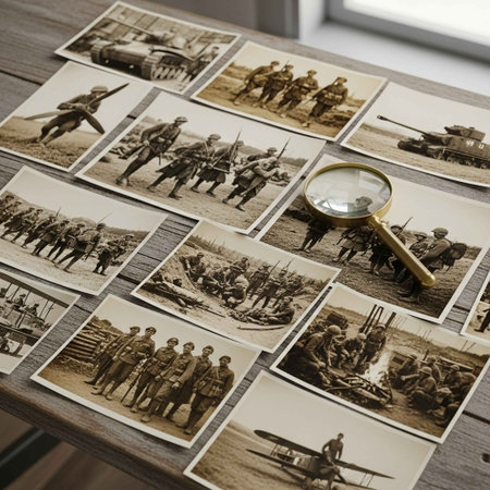 World War II photo collage. Selective focus on the magnifying glass