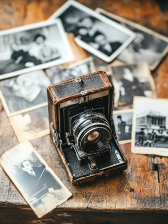 A vintage camera resting on a rustic table surrounded by old photographs and papers, evoking nostalgia and the passage of time in a timeless setting.