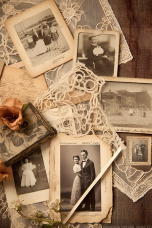 Old vintage photographs laid scattered on a rustic table, creating a warm and nostalgic atmosphere ideal for antique enthusiasts.