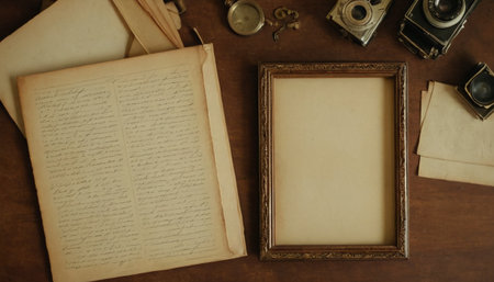 A close-up of a vintage camera on a wooden table, surrounded by antique photographs and papers, capturing the essence of nostalgia and history.