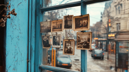 A serene view of vintage photographs hanging in a charming blue window, capturing memories amidst an urban landscape on a rainy day.