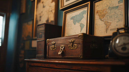 A cozy vintage decor scene featuring a world map surrounded by antique frames, photographs, and travel memorabilia, creating a warm and inviting atmosphere.