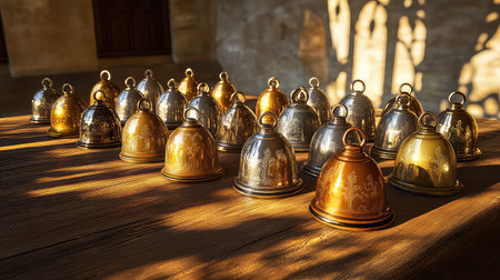 A captivating arrangement of vintage decorative bells made of metal, reflecting warm sunlight and creating soft shadows, enhancing their intricate designs.