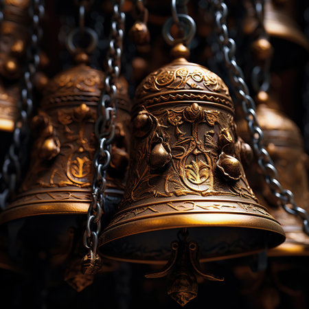 This close-up image showcases intricate vintage decorative bells, featuring detailed patterns and an elegant antique finish, perfect for artistic projects.