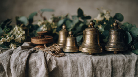 A beautifully styled arrangement of vintage bells and greenery on a linen fabric, creating a serene atmosphere perfect for home decoration and rustic interiors.
