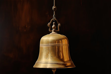 A close-up of a vintage brass bell hanging from a wooden frame, with intricate detailing and a rustic background, evoking a classic, nostalgic feel.