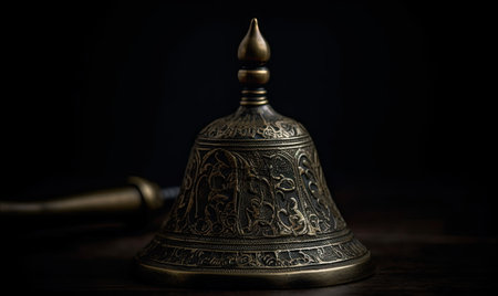 The dark background accentuates the elegance of the vintage hand bell. Creating using generative AI tools
