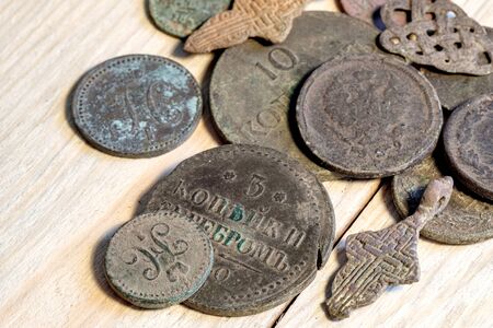 Old tsarist money of the Russian empire on a wooden table. old coins
