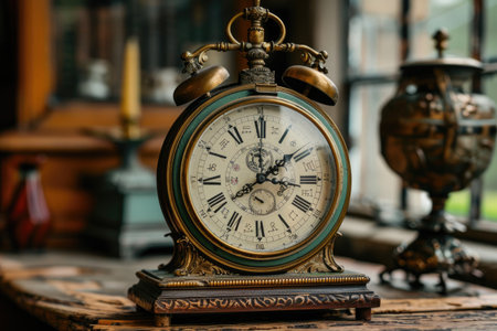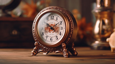 Vintage alarm clock resting on rustic wooden table in warm lighting setting ambience