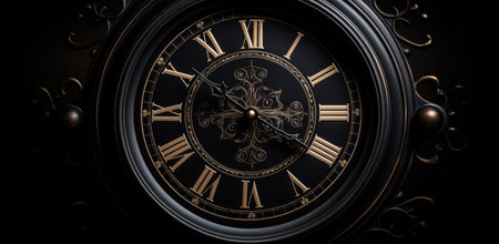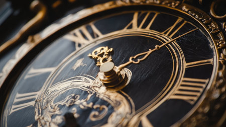 Close-up image showing the face and hands of a luxury antique clock with roman numerals
