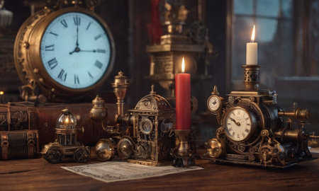 Vintage desk adorned with antique clocks and chains to evoke a nostalgic and charming ambiance