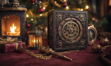 A vintage clock rests on a bed of shimmering decorations, surrounded by twinkling lights and golden ornaments, perfect for a festive atmosphere.