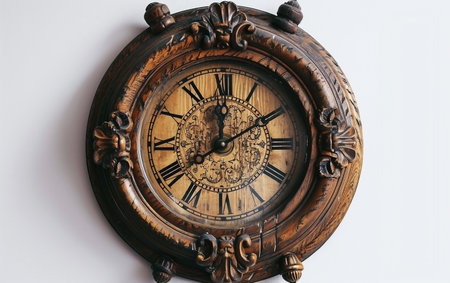 Ornate vintage clock face with roman numerals telling the time on a wooden background