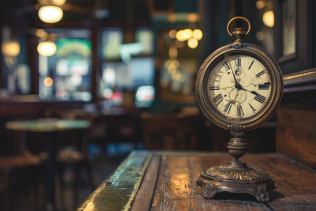 A vintage clock sits on a wooden table in a dimly lit pub. The clocks face is weathered and worn, reflecting the passage of time.