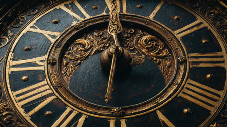 This striking close-up of a vintage clock face captures intricate details such as Roman numerals and ornate hands, creating a timeless aesthetic.