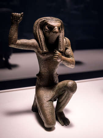 Falcon-headed Horus of Pe, Lower Egypt, statuette in attitude of jubilance, bronze, late period, 664-332 BC, Egypt, collection of the British Museum