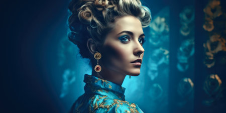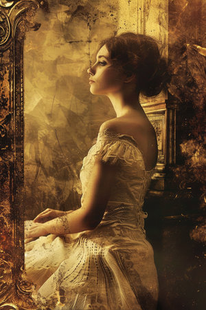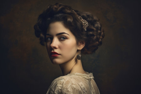 Vintage-inspired portrait of a woman with an elaborate hairstyle, her disappointed gaze captured against a timeless, textured studio background