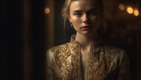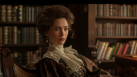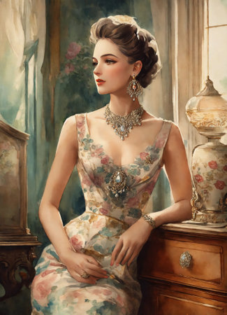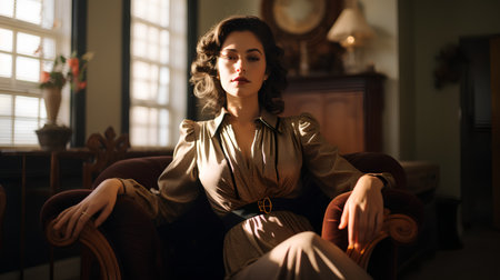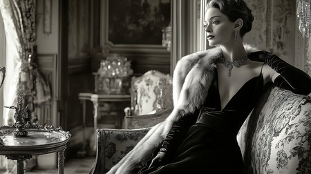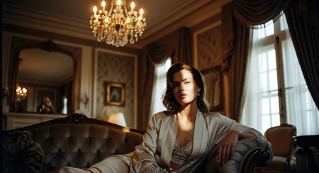 A stunning portrait of a woman in elegant fashion exuding timeless grace in a luxurious setting.