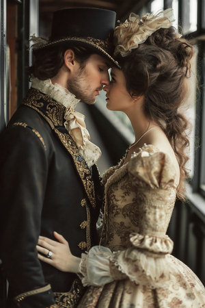 A couple dressed in exquisite vintage clothing is sharing a tender moment, highlighting intricate details of their costumes and the warm ambiance of a historical environment