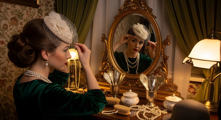 A beautiful woman dressed in 1920s or 1930s vintage style, wearing a green velvet dress and pearls, adjusts her veiled fascinator hat. She looks at her reflection in an ornate, gold-framed vanity mirror in a dimly lit, elegantly decorated room. The scene evokes nostalgia, elegance, and retro fashion.