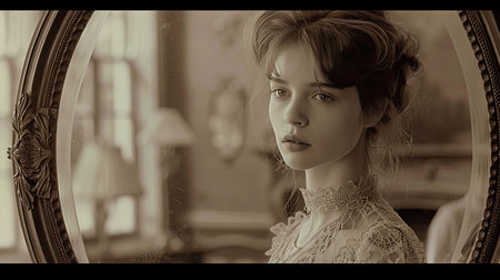 Vintage photo of beautiful young woman looking in the mirror. Selective focus.