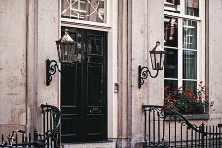 Architectural detail of a building on the main city center street of Amsterdam in Netherlands, european architecture