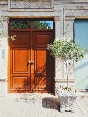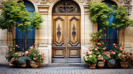 A stunning wooden door set within an ornate architectural facade, surrounded by vibrant greenery and filtered sunlight, evokes a sense of tranquility and charm.
