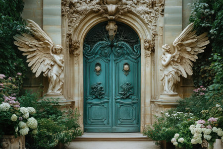 A large teal door with angel wings on each side, surrounded by flowers and greenery, leads to an ornate room in Paris. The symmetrical composition has a cinematic, grandiose quality, reminiscent of the Rococo style. This is an architectural photograph. --ar 3:2 --v 6.1 Job ID: fdb3b9ed-7a65-4f2b-9081-04d28ff8f9d3