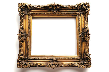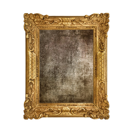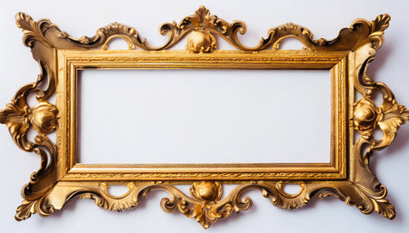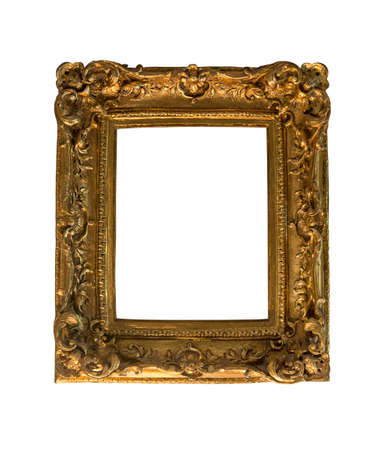 Empty antique gold colored picture frame with ornate baroque design is waiting to display your masterpiece