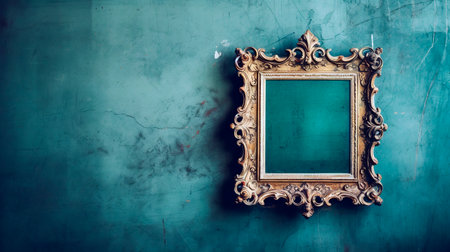 An exquisite ornate golden picture frame on a deep blue wall, ideal for showcasing art or photographs in elegant and stylish interior spaces.