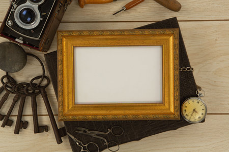 Photo frame, clock, keys, camera on wooden table, Close-up