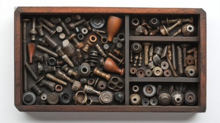 This image features a diverse array of rusty hardware pieces showcased in a vintage wooden organizer tray, perfect for showcasing craftsmanship and industrial design.