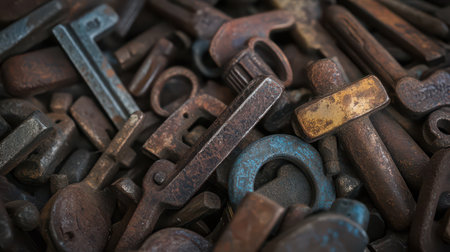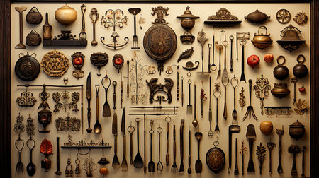 A captivating arrangement of vintage tools and accessories showcasing various elements of craftsmanship. Ideal for creative projects and artistic inspirations.